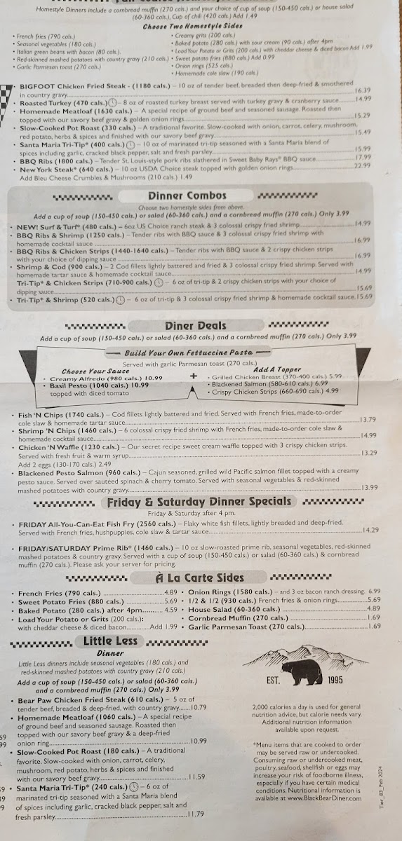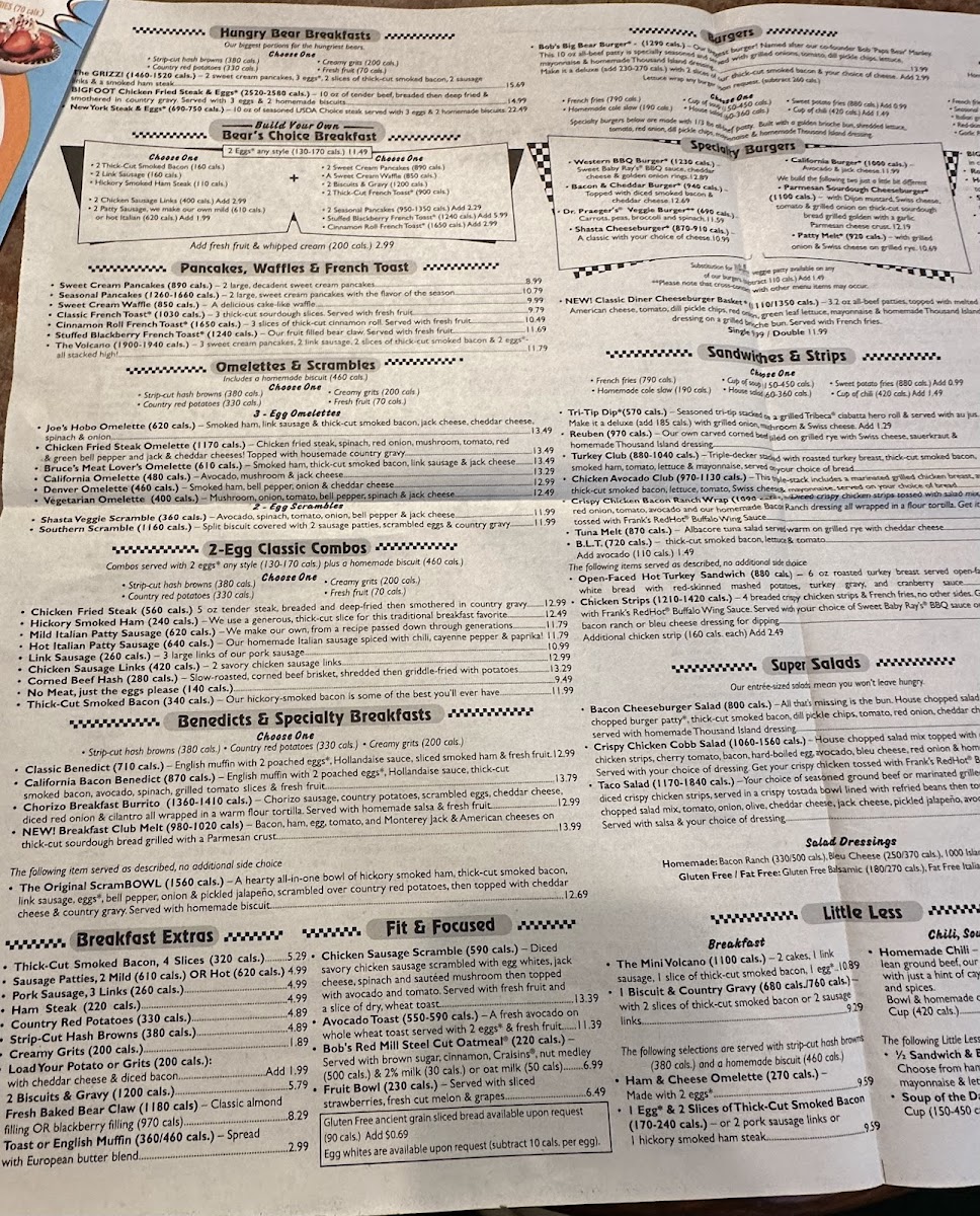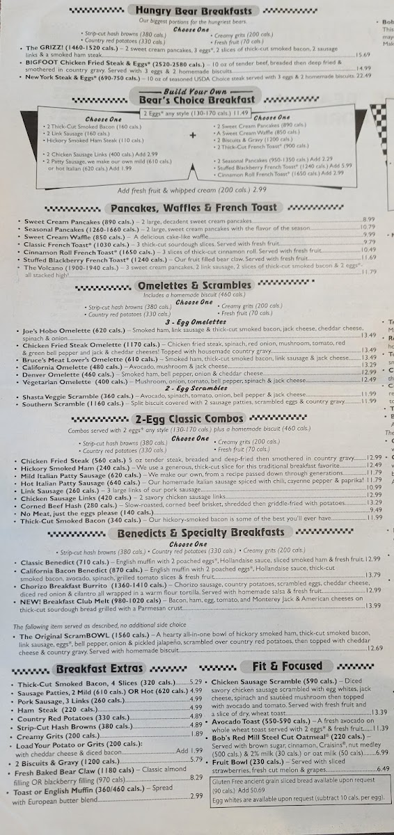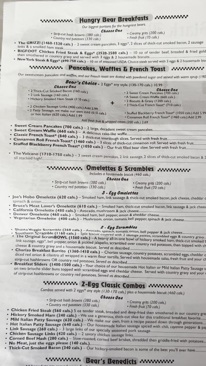 4 Bear Paw Chicken Fried Steaks with country gravy, served with 8 Scrambled eggs, 4 housemade biscuits and your choice of strip-cut hash browns or country red potatoes.