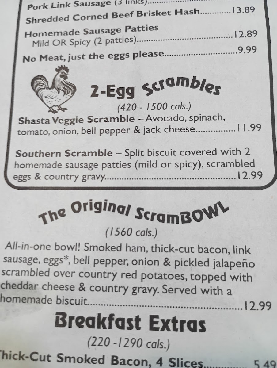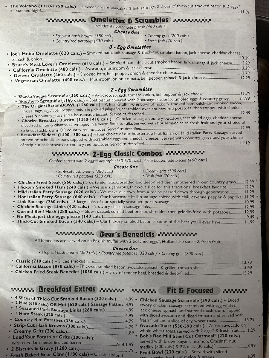 A hearty all-in-one bowl of ham, bacon, link sausage, eggs, bell pepper, onion & pickled jalapeño, scrambled over country red potatoes, then topped with cheddar cheese & country gravy. Served with a housemade biscuit.